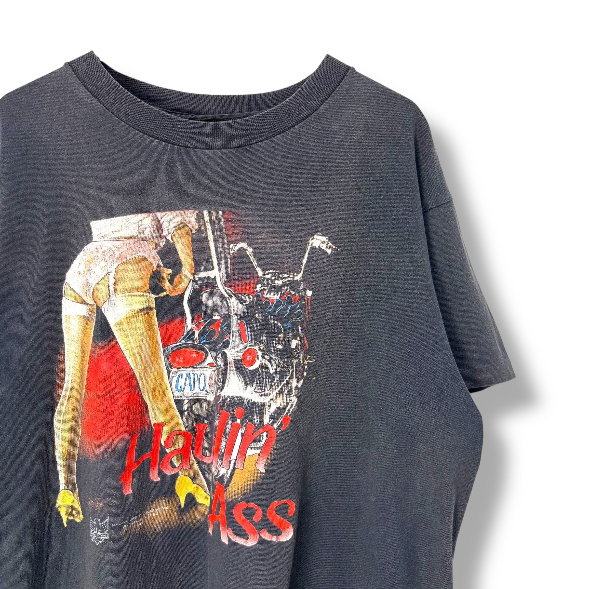 90s Haulin' Ass Pin-up Girl Bike Print T-Shirt 90年代 バイク Tシャツ ハーレー ピンナップガール シングルステッチ フェード 墨黒