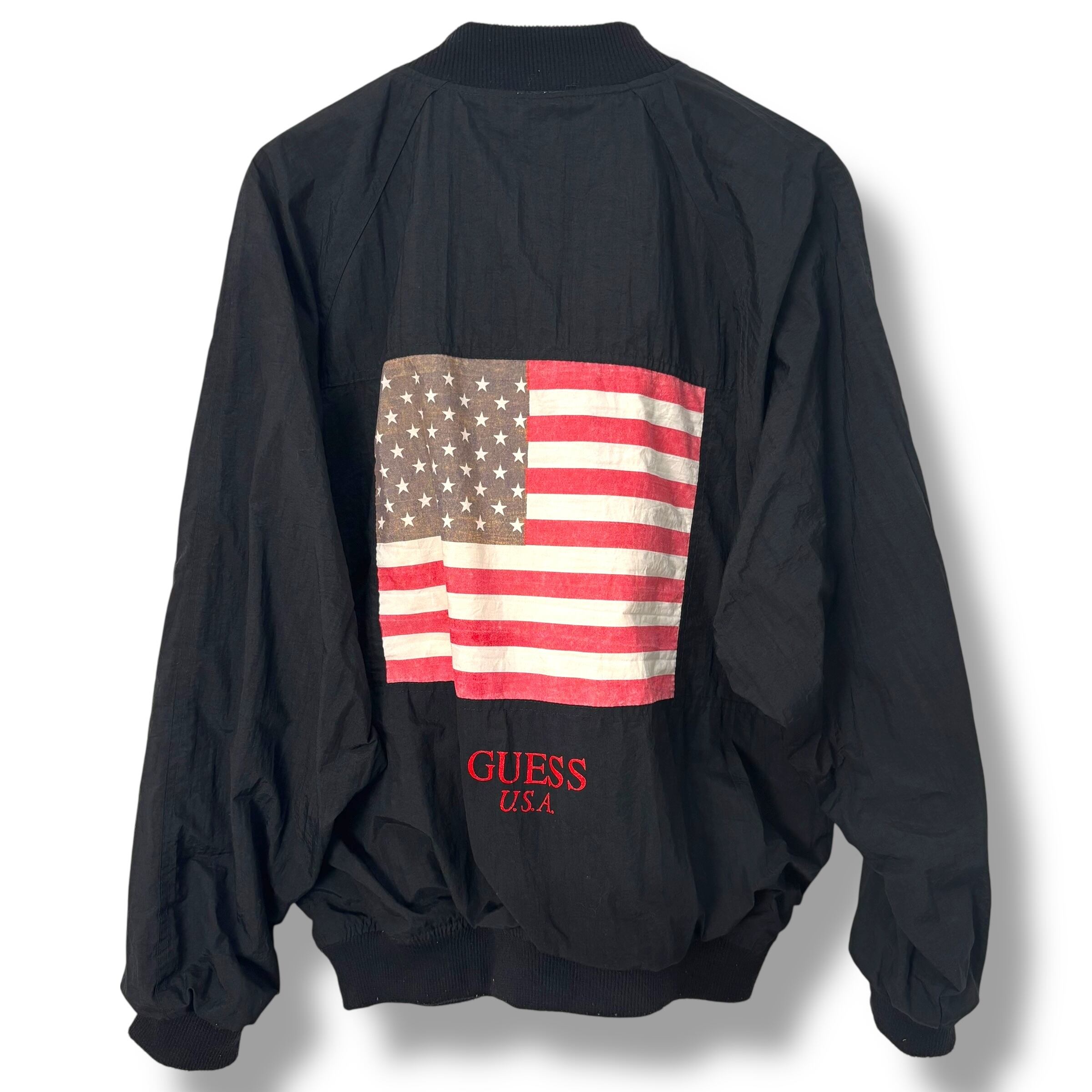 90s GUESS "American Flag" Nylon Jacket 90年代 ゲス 星条旗 ナイロンジャケット ブラック アメリカンフラッグ