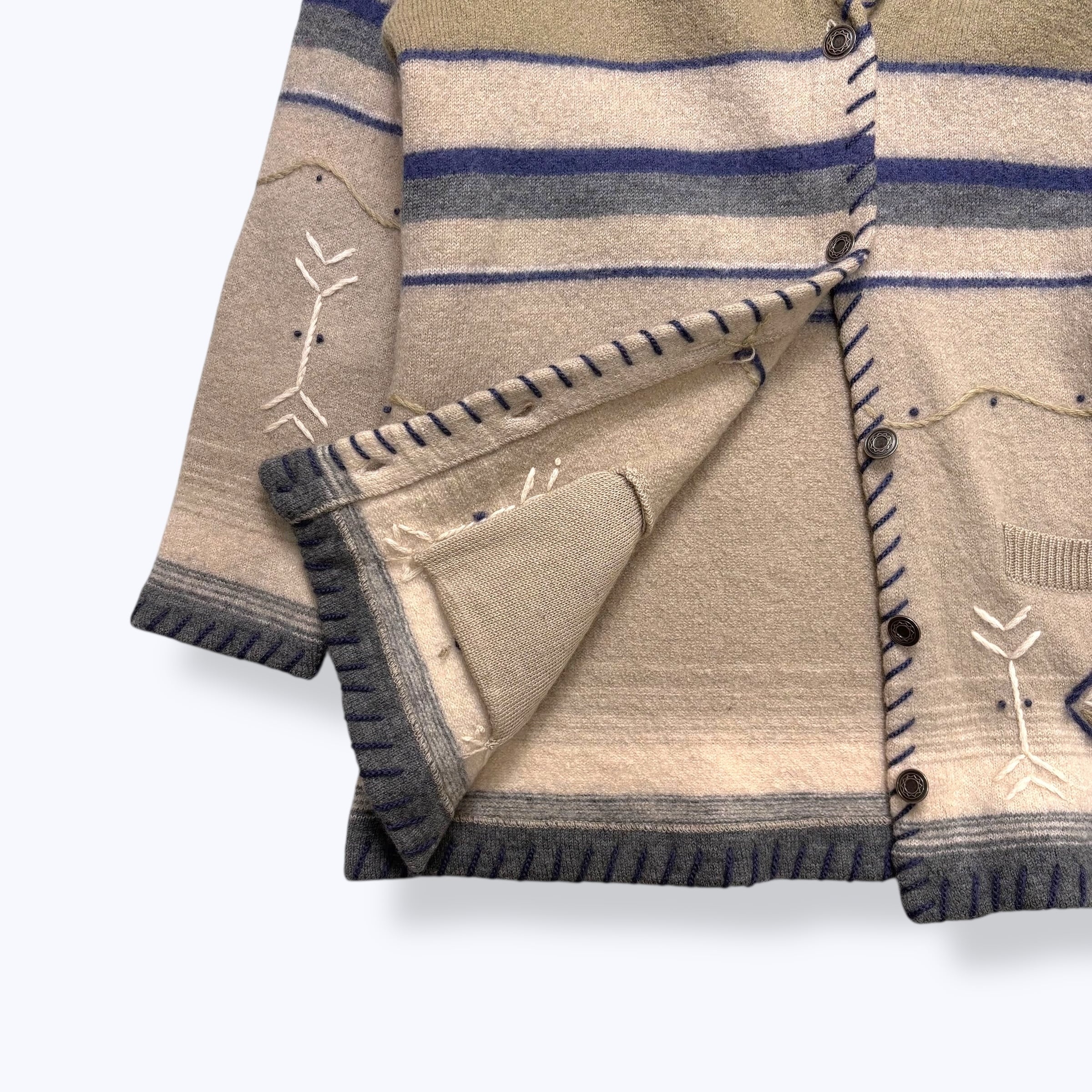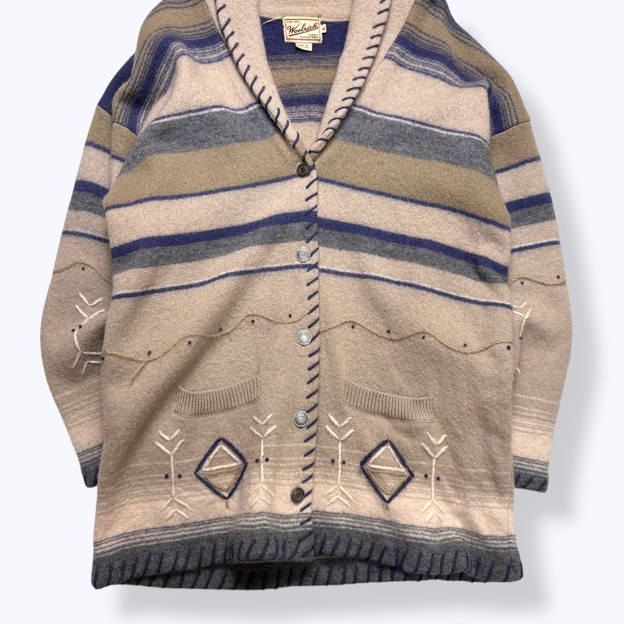 90s Woolrich Multi Border Shawl Collar Blanket Cardigan 【XL】 90年代 ウールリッチ ショールカラーニット マルチボーダー メリノウール カーディガン ネイティブ柄 ニットガウン