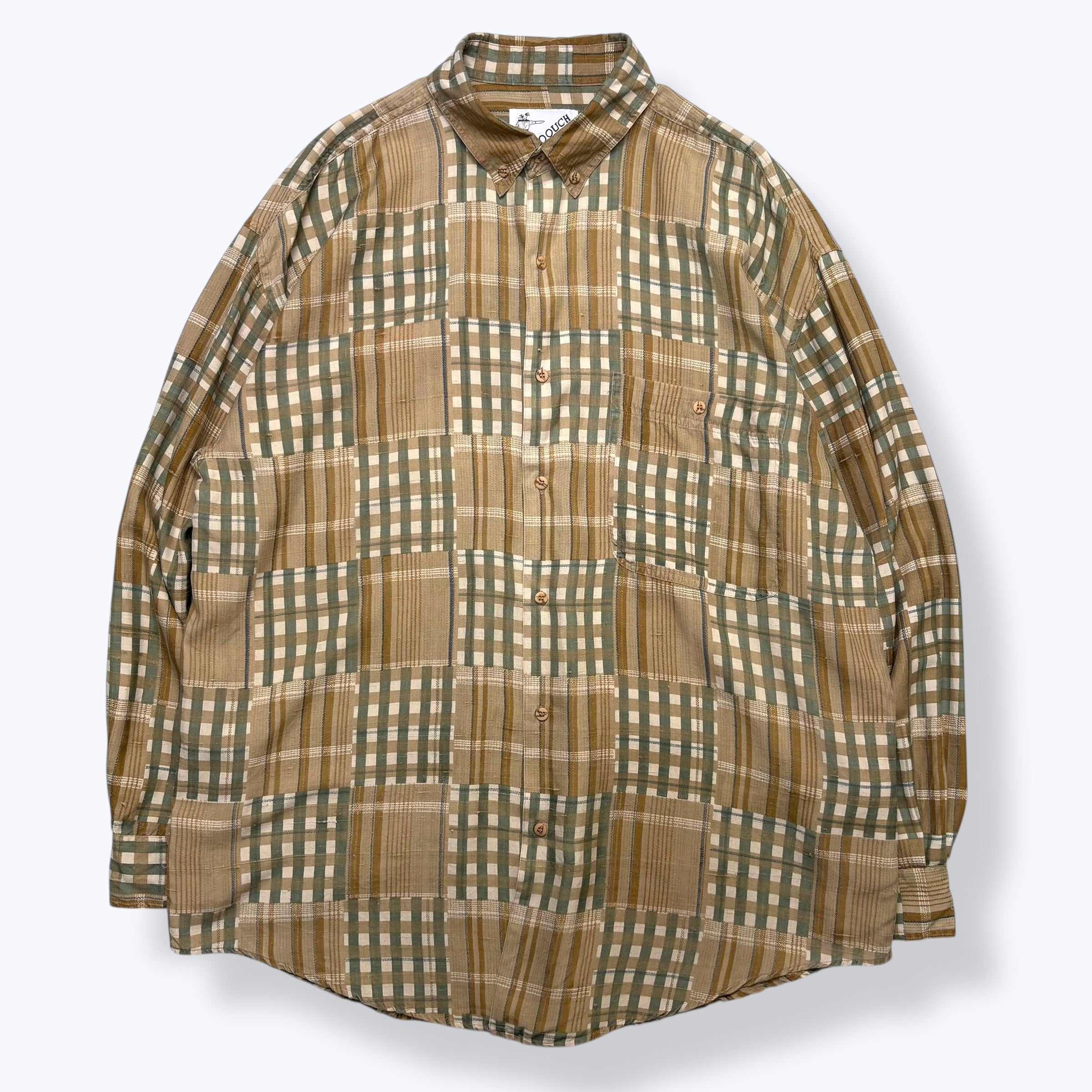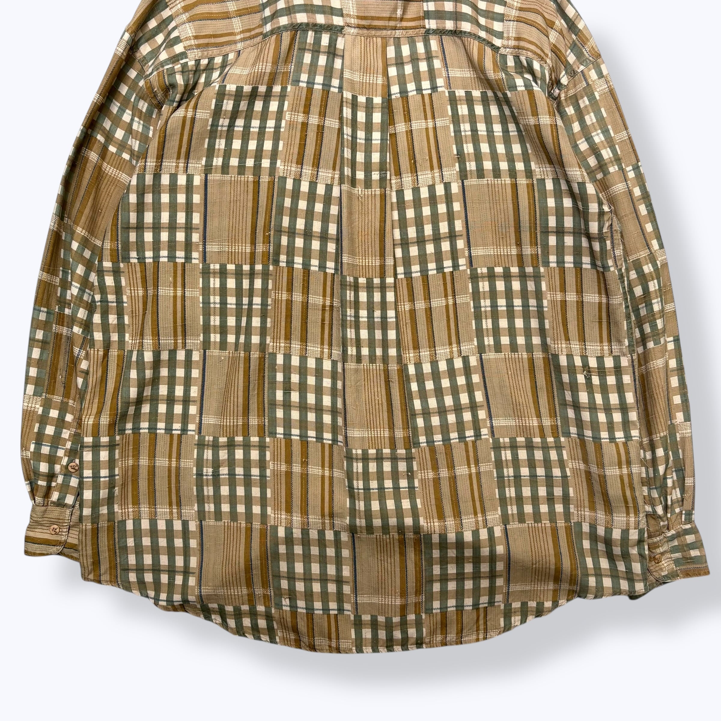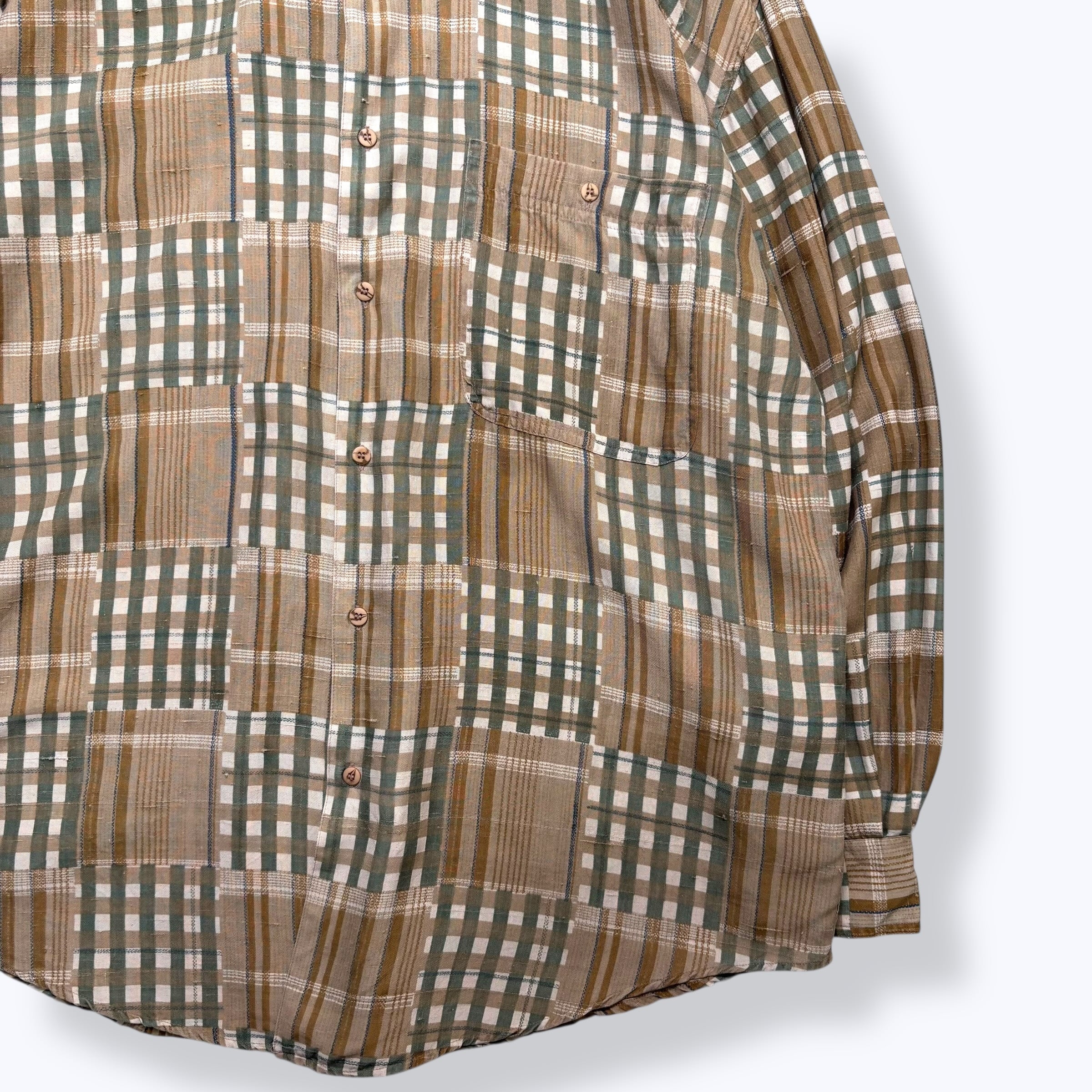 80s~ DEAD STOCK GOOUCH Patchwork Check Silk Shirts 【XL】 80年代 90年代 グーチ パッチワーク チェック シルク シャツ ブラウン 古着 ヴィンテージ デッドストック 未使用