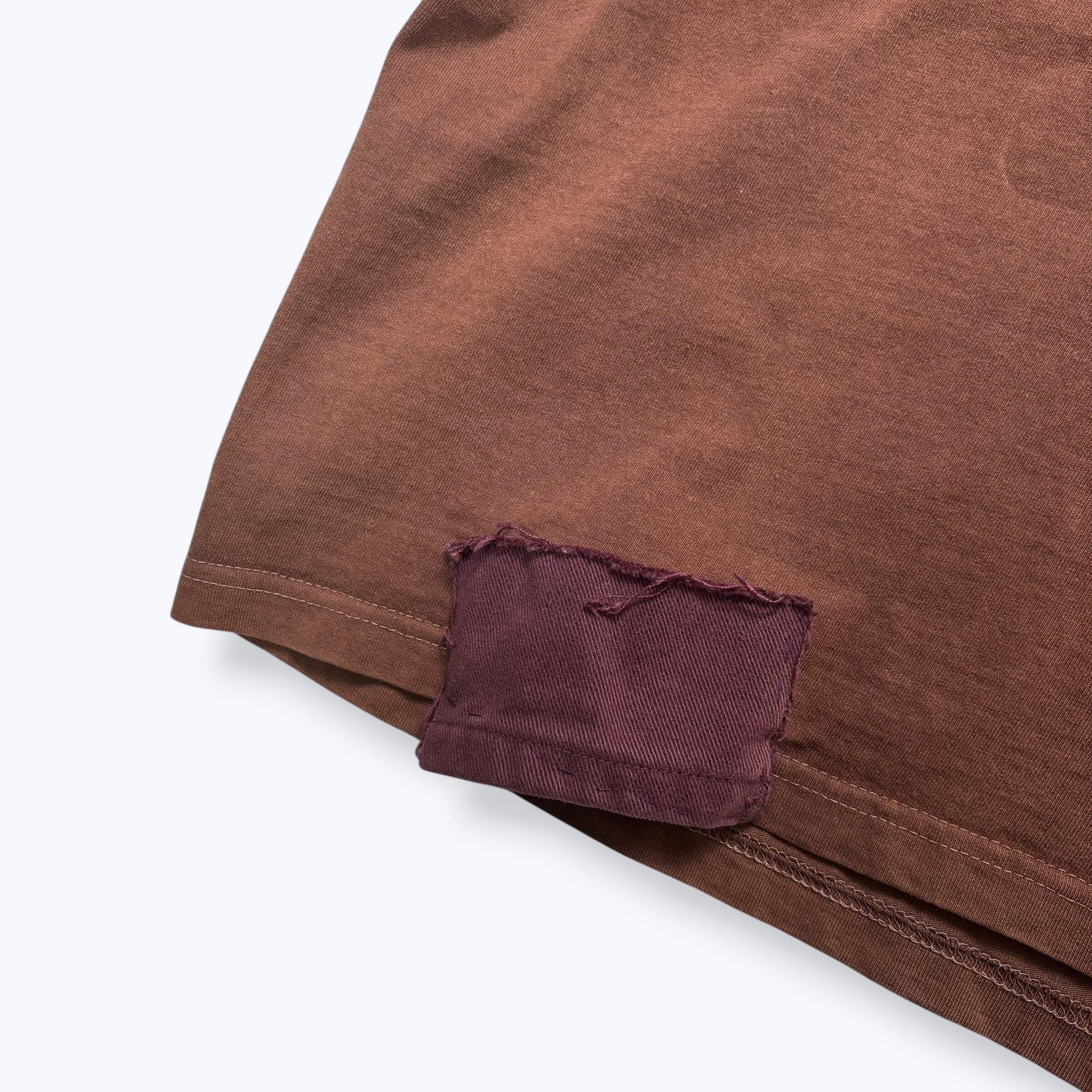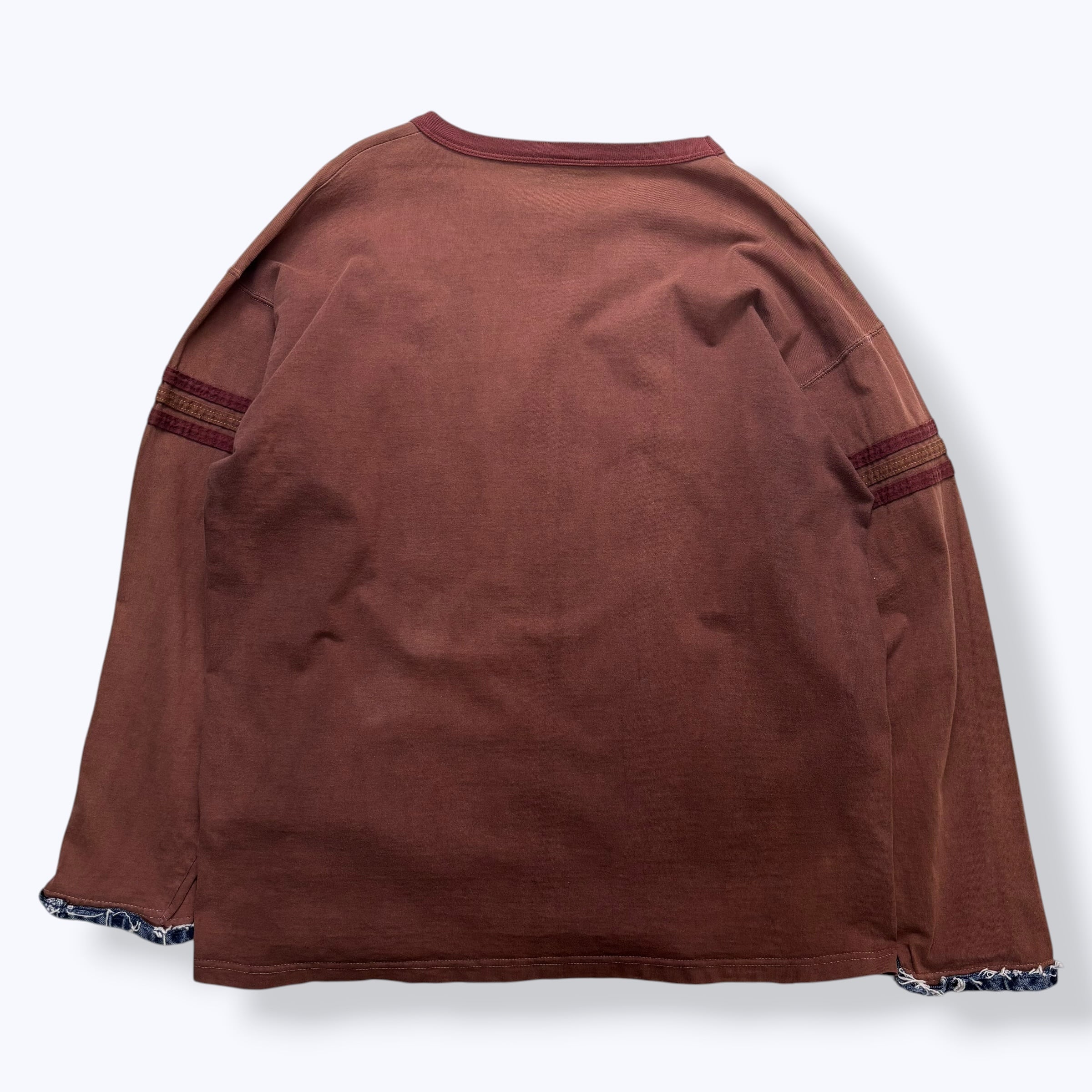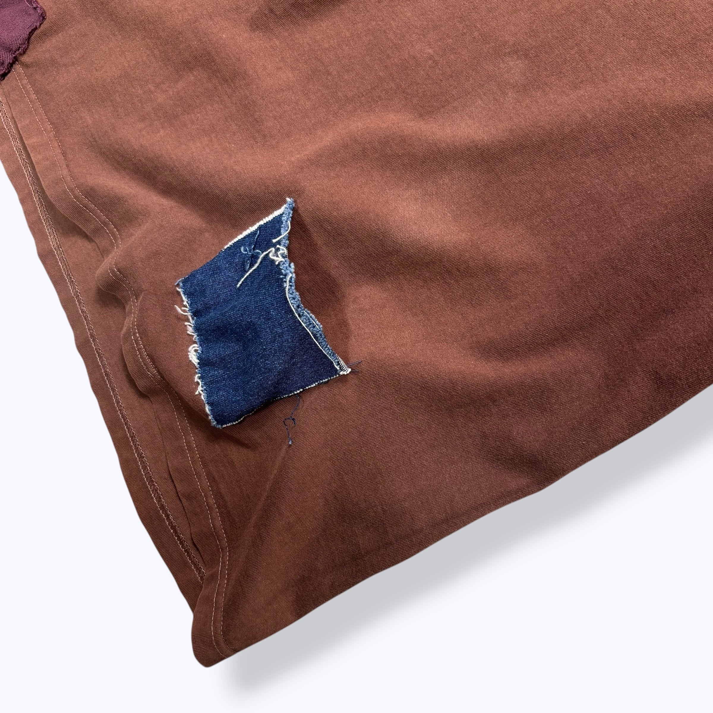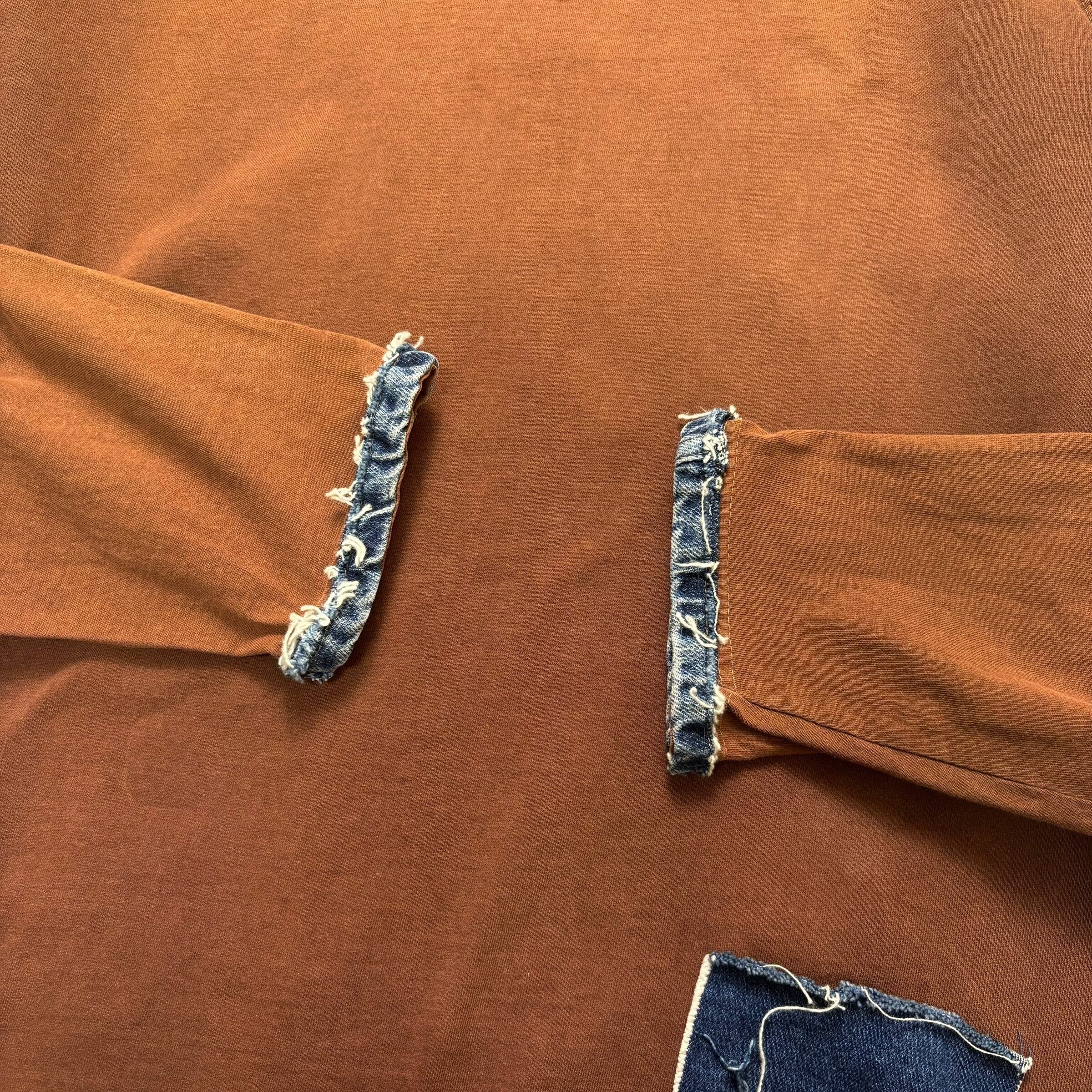 ブラウンボディーのフットボールTシャツに同色系の生地と濃紺のデニム生地が張られた1枚。