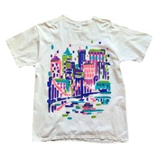 ポップなタッチと色使いで高層ビル群が描かれています◎